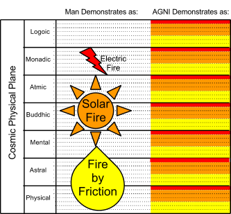 “Lord Agni shows forth His fiery life on the atomic subplane of each plane; He shows forth as solar fire on the second, third and fourth, and as 'fire by friction' on the fifth, sixth and seventh. From the point of view of the microcosm, the Spark in the Flame, man demonstrates as electric fire on the second plane, or the second cosmic ether; as solar fire on the third, fourth and the three higher subplanes of the fifth plane, and as fire by friction on the lower subplanes of the fifth, on the sixth, and seventh planes.” (CF 521)